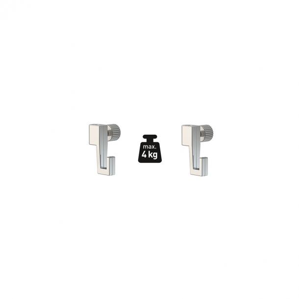 Deze ophanghaak heeft een manuele bediening. Door het schroefje los te draaien kan de ophangdraad in de haak geschoven worden. Op de gewenste plek kan de haak vastgezet worden op de draad door het schroefje vast te draaien. De maximale draagkracht van de haak is 4 kg.