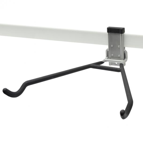 Met deze Duraline universele railhaak kun je fietsen en ander groot gereedschap ophangen. Deze railhaak kunt u gebruiken op de bovenrail die apart wordt verkocht of kan direct aan uw muren wordt geschroefd.