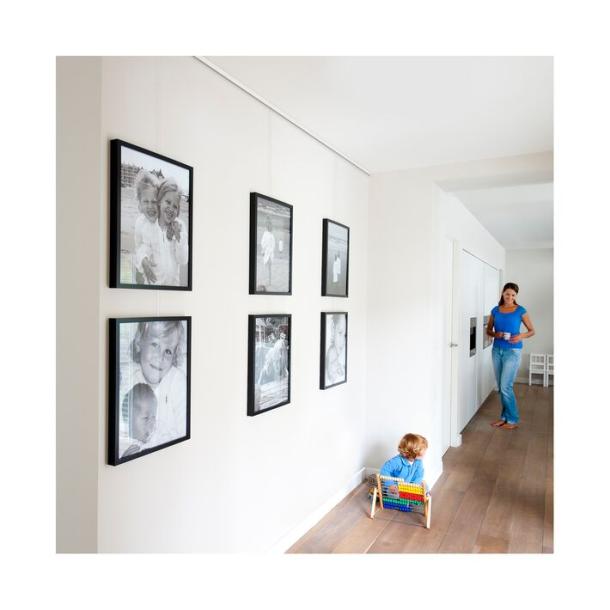 - Product description If you install a Click Rail on the wall (and against the ceiling), you have the flexibility to decorate the walls without damaging them. With Artiteq's hanging wires and hooks, moving, changing or adding a frame or a different wall decoration is a piece of cake. The rail is attached firmly to the wall using clips and the transparent perlon hanging wires can easily be slid into the side of the rail. The complete all-in Click Rail aluminium 2-m set contains a 200-cm Click Rail, 2 hanging wires with a 4-kg hook and all the mounting materials. This rail has a brushed aluminium finish.